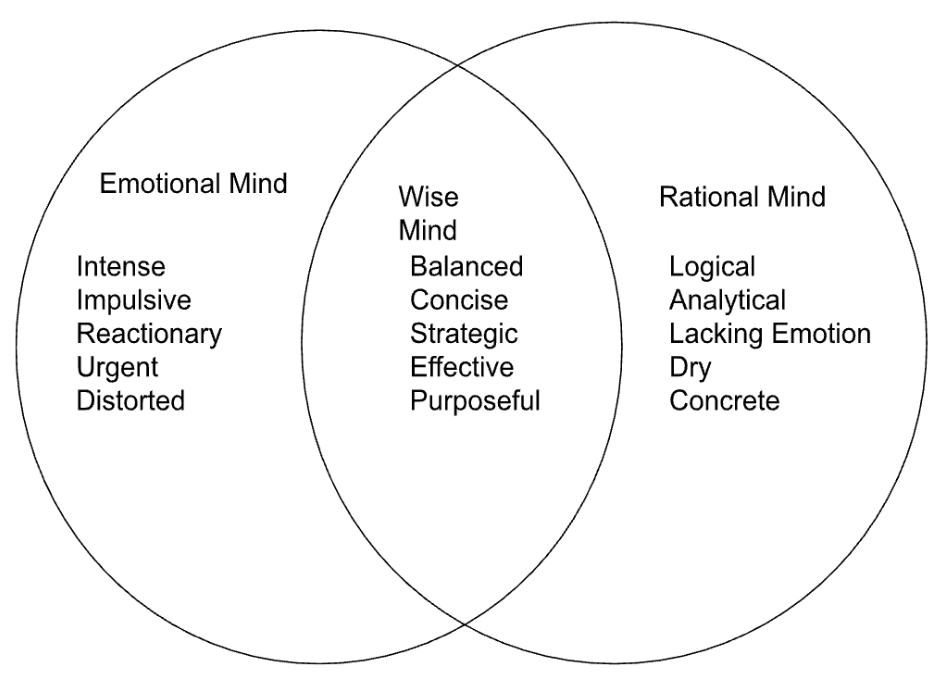The Wise Mind is the balance of the two. When we are too Rational, or too Emotional, our communication becomes distorted, one-sided, or even lost in translation due to the analytical nature of what we are explaining. The Wise Mind comes about when we spend time exploring our Mind States and identify the emotion, passions, and urgency in what we want to say and pair that with the Rational Mind of facts, logic, and analysis to come together so that we can articulate effectively what we want to say.